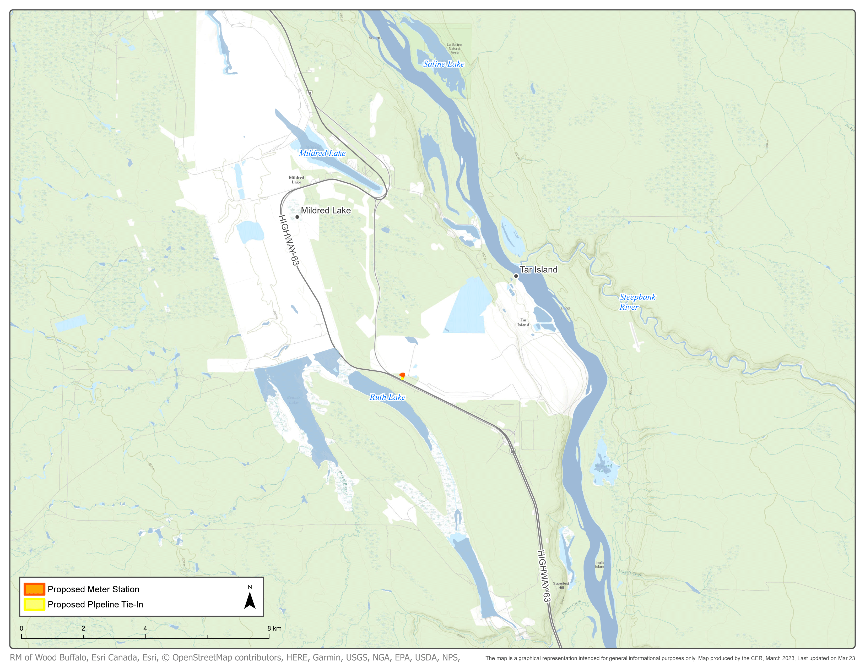 NOVA Gas Transmission Ltd. (NGTL) has filed a project application for the Mildred Lake West Sales Meter Station Project. The project involves the installation of a new 2-1010U ultrasonic meter station, with two NPS 10-meter runs, including: two 3.2 m x 15 m skids containing a meter run building and separator; one 2.9 m x 6.5 m instrumentation building skid; approximately 35 m of NPS 10 upstream yard piping from the meter buildings to the lease edge; approximately 115 m of NPS 12 piping to tie-in the meter station to the NGTL System; and approximately 45 m of NPS 10 downstream yard piping from the meter buildings to the customer tie-in. The project also involves associated facility piping, valves, instrumentation, controls, communications devices and pipeline appurtenances. The project will be located approximately 33 km northwest of Fort McMurray, Alberta on Crown land in NE 16-092-10 W4M for the meter station and connection pipe, and on a combination of Crown (SE 21-092-10 W4M, NE 16-092-10 W4M, N ½ 15-092-10 W4M and a portion of SE 15-092-10 W4M) and freehold lands (portion of SE 15-092-10 W4M) for a permanent approximately 1.93 km access road. The Project will require the acquisition of approximately 2.72 ha of new Crown land and approximately 0.15 ha of freehold land. Temporary workspace is anticipated to be required for construction of the project.