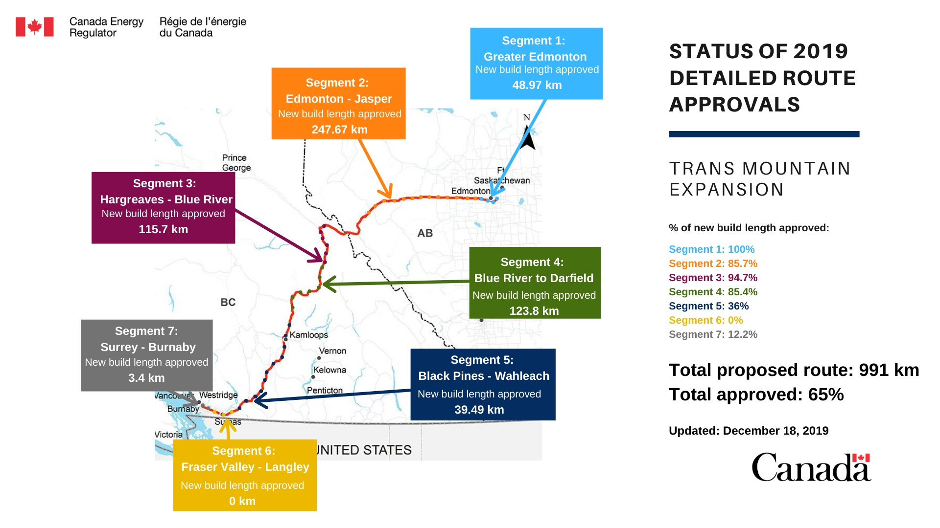 The Commission of the Canada Energy Regulator has now approved 65 per cent of the total route of the Trans Mountain Expansion Project (TMEP). Oral hearings are set to take place in January and February, 2020, for the six hearings within Segments 2-4. Decisions on timing related to the hearings for Segmentsr 5 to 7 will be decided in the new year.