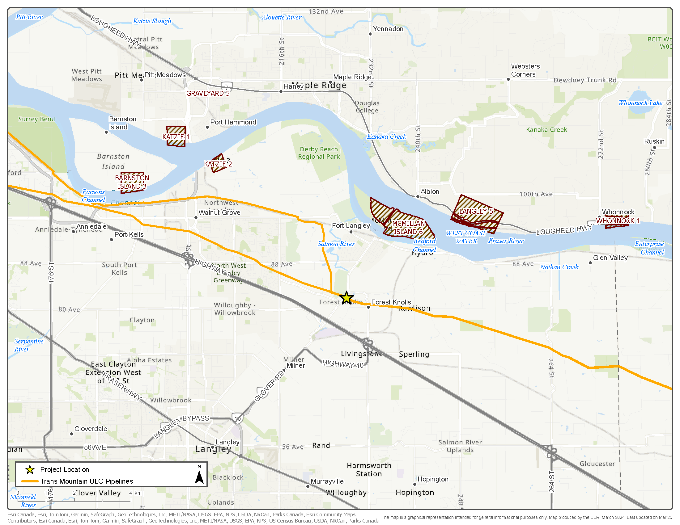 The Project is located on privately-owned lands, municipal lands, and provincial Crown lands, within the traditional territories of Indigenous groups, and in the Township of Langley (the Township) and Metro Vancouver Regional District in the province of British Columbia at kilometre post (KP) 1115.8 on the Line 1 Trans Mountain system. The replacement segment will require one installation of the pipeline (crossing) of Salmon River in an area of provincial Crown land unoccupied by municipal or private development, and one installation/crossing of Glover Road. The Project site extends from the Belmont Golf Course at the western extent to a residential area in the Forest Knolls neighbourhood at the eastern extent.
