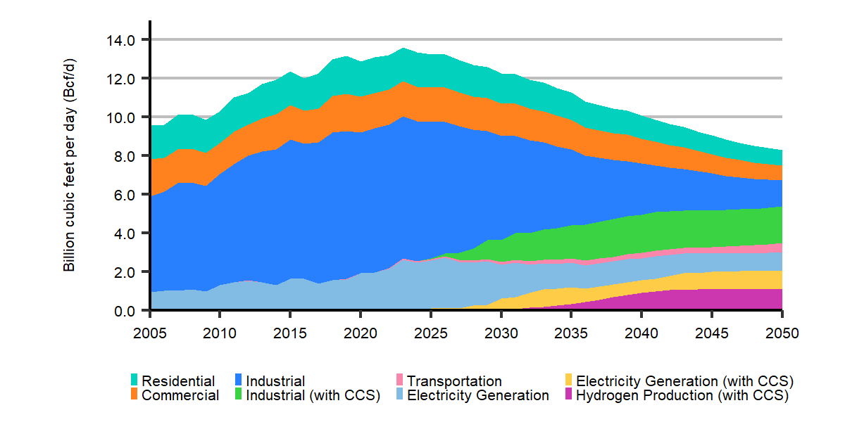 Description: This chart breaks down total natural gas demand by sector for the Evolving Policies Scenario. Residential demand is 1.8 billion cubic feet per day (bcf/d) in 2020, 1.4 bcf/d by 2035, and 0.8 bcf/d by 2050. Industrial demand is 7.3 bcf/d in 2020, 3.8 bcf/d by 2035, and 1.4 bcf/d by 2050. Transportation demand is 0.0 bcf/d in 2020, 0.2 bcf/d by 2035, and 0.5 bcf/d by 2050. Commercial demand is 1.9 bcf/d in 2020, 1.5 bcf/d by 2035, and 0.8 bcf/d by 2050. Electricity generation demand is 1.9 bcf/d in 2020, 1.3 bcf/d by 2035, and 1.0 bcf/d by 2050. Industrial with CCS demand is 0 bcf/d in 2020, 1.7 bcf/d by 2035, and 1.9 bcf/d by 2050. Electricity generation with CCS is 0 bcf/d in 2020, 0.9 bcf/d by 2035, and 0.9 bcf/d by 2050. Hydrogen production with CCS demand is 0 bcf/d in 2020, 0.3 bcf/d by 2035, and 1.1 bcf/d by 2050.
