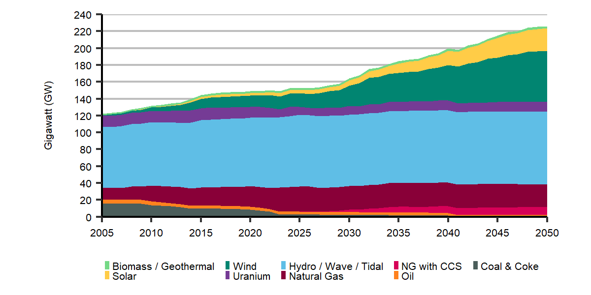 Description: This stacked area chart shows electricity generation capacity by fuel type for the Evolving Policies Scenario from 2005 to 2050. Total generation capacity increases from 149 gigawatts (GW) in 2020 to 226 GW in 2050. Biomass and geothermal capacity increase from 2 GW in 2020 to 3 GW in 2050. Solar capacity increases from 3 GW in 2020 to 27 GW in 2050. Wind capacity increases from 14 GW in 2020 to 61 GW in 2050. Uranium capacity decreases from 13 GW in 2020 to 12 GW in 2050. Hydro / wave / tidal capacity increases from 81 GW in 2020 to 86 GW in 2050. Natural gas capacity increases from 24 GW in 2020 to 27 GW in 2050. Natural gas with CCS capacity increases from 0 GW in 2020 to 9 GW in 2050. Oil capacity decreases from 4 GW in 2020 to 4 GW in 2050. Coal and coke capacity decreases from 8.5 GW in 2020 to 0 GW in 2050.