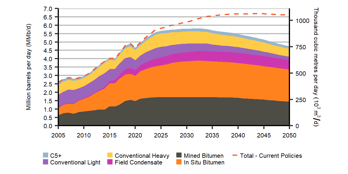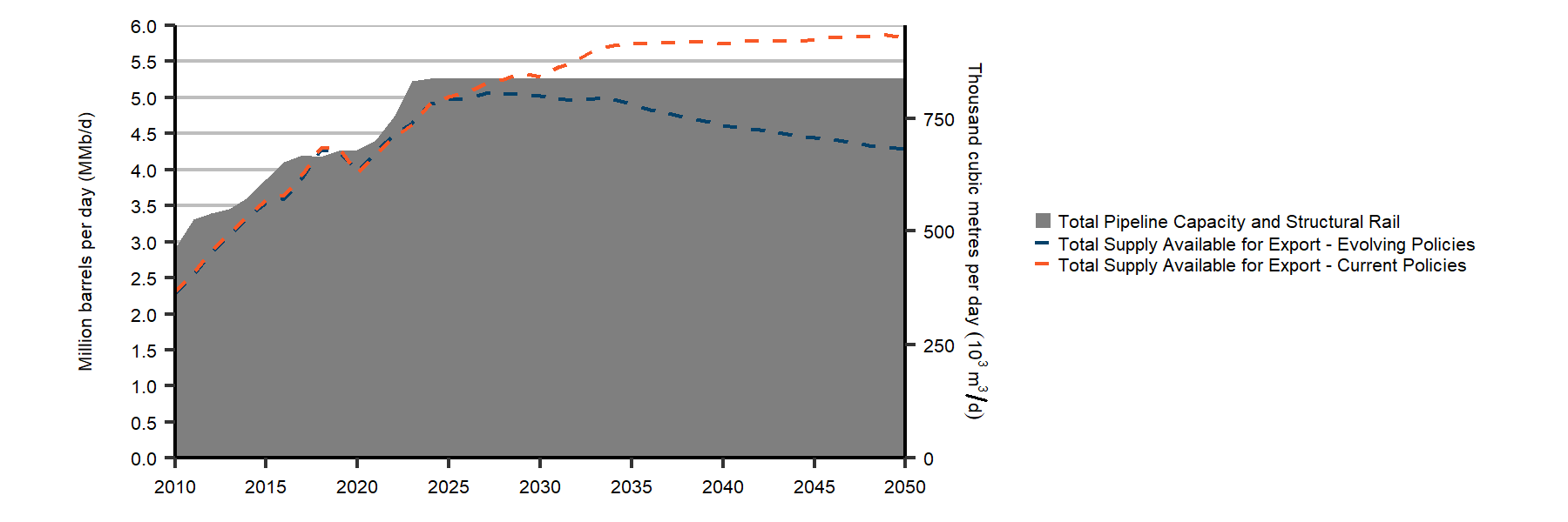 5. In the Evolving Policies Scenario, crude oil production grows much more slowly than in the past decade, rising 16% to a peak of 5.8 MMb/d in 2032. Afterwards, production declines slowly to 2050. As crude oil available for export from western Canada increases over the next decade , it comes close to filling the level of total export capacity that would be provided by existing pipeline capacity, planned pipeline expansions, and structural rail.
