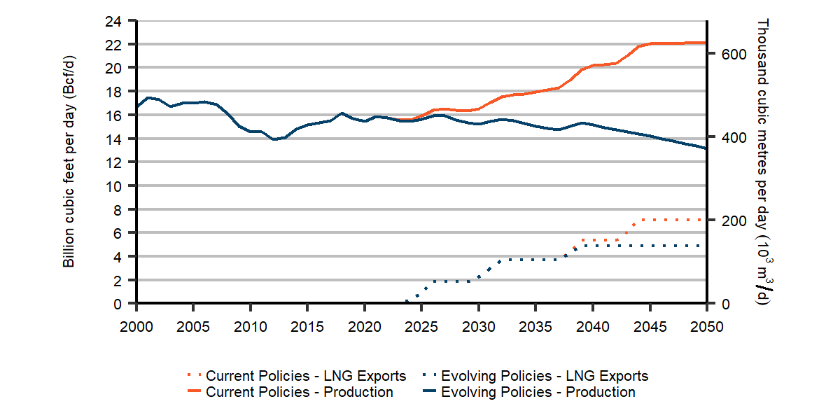 Description: This graph shows total natural gas production and liquified natural gas exports for the Evolving Policies and Current Policies scenarios from 2000 to 2050. Current Policies total production increases from 15 billion cubic feet (bcf) in 2015 to 22 bcf in 2050. Evolving Policies total production decreases from 15 bcf in 2015 to 13.1 bcf in 2050. Current Policies liquified natural gas exports increase from 0.3 bcf in 2024 to 7.1 bcf in 2050. Evolving Policies liquified natural gas exports increase from 0.3 bcf in 2024 to 4.9 bcf in 2050.