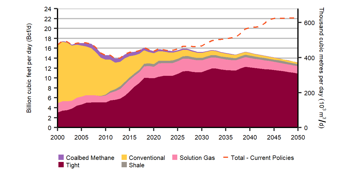 Description: This graph shows natural gas production by type from 2005 to 2050 in the Evolving Policies Scenario, and total natural gas production for the Current Policies Scenario. Total production in 2015 was 15.1 billion cubic feet per day (Bcf/d), with tight and shale gas production at 9.7 Bcf/d in the Evolving Policies Scenario. In 2050, total gas production is 13.1 Bcf/d in the Evolving Policies Scenario, with tight and shale gas making up the majority of production at 12.4 Bcf/d. In the Current Policies Scenario, total production increases to 22.2 Bcf/d by 2050.