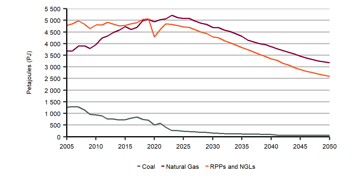 Description: This chart breaks down fossil demands by fuel over the projection period for the Evolving Policies Scenario. Coal demand declines from 503 Petajoules (PJ) in 2020 to 58 PJ in 2050. Refined petroleum product (RPP) and natural gas liquids (NGL) demands decline from 4 290 PJ in 2020 to 2 619 PJ in 2050. Natural gas demands decline from 4 940 PJ in 2020 to 3 189 PJ in 2050. Total fossil fuel demand in the Evolving Policies Scenario declines from 10 774 PJ in 2018 to 5 867 PJ in 2050.