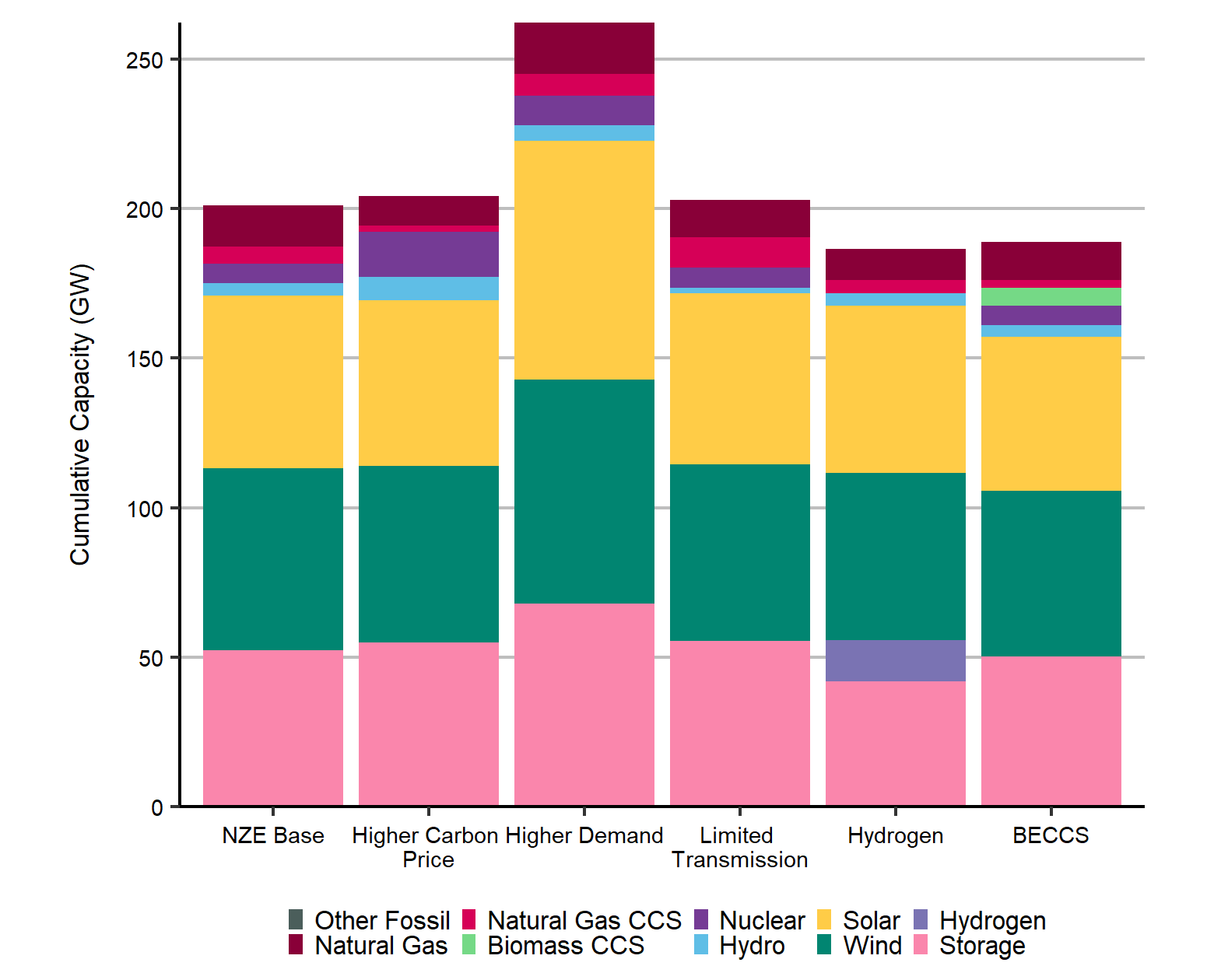 Description: This graph shows the amount of capacity that is added between 2019 and 2050 for the following scenarios: NZE Base, Higher Carbon Price, Higher Demand, Limited Transmission, Hydrogen, and BECCS. For the NZE Base scenario, natural gas is 14 GW, natural gas with CCS is 6 GW, nuclear is 7 GW, hydro is 4 GW, solar is 58 GW, wind is 61 GW, and storage is 52 GW. For the Higher Carbon Price scenario, natural gas is 10 GW, natural gas with CCS is 2 GW, nuclear is 15 GW, hydro is 8 GW, solar is 56 GW, wind is 59 GW, and storage is 55 GW. For the Higher Demand scenario, natural gas is 17 GW, natural gas with CCS is 7 GW, nuclear is 10 GW, hydro is 5 GW, solar is 80 GW, wind is 75 GW, and storage is 68 GW. For the Limited Transmission scenario, natural gas is 13 GW, natural gas with CCS is 10 GW, nuclear is 7 GW, hydro is 2 GW, solar is 57 GW, wind is 59 GW, and storage is 55 GW. For the Hydrogen scenario, natural gas is 10 GW, natural gas with CCS is 4 GW, hydro is 4 GW, solar is 56 GW, wind is 56 GW, hydrogen is 14 GW and storage is 42 GW. For the BECCS scenario, natural gas is 13 GW, natural gas with CCS is 3 GW, biomass with CCS is 6 GW, nuclear is 7 GW, hydro is 4 GW, solar is 52 GW, wind is 55 GW, and storage is 50 GW.