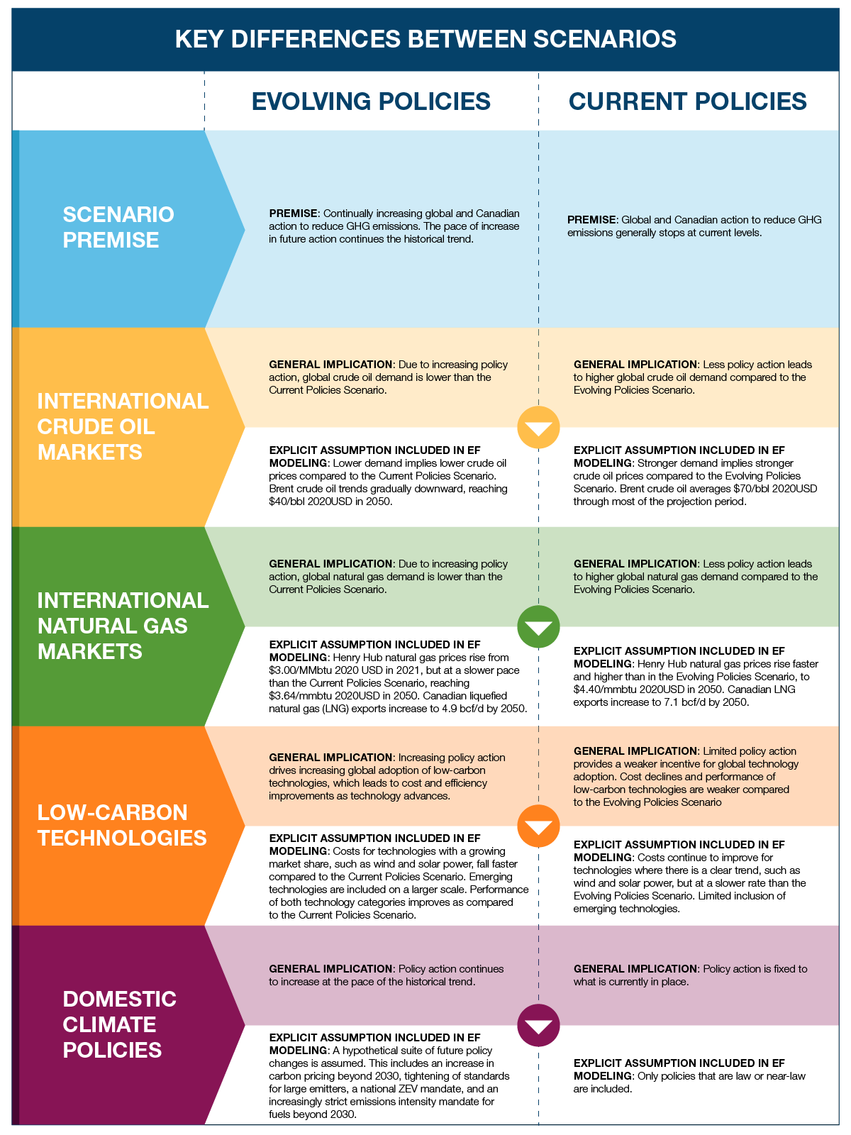 | Explicit Assumption Included in EF Modeling | Henry Hub natural gas prices rise from $3.00/MMbtu 2020 USD in 2021, but at a slower pace than the Current Policies Scenario, reaching $3.64/mmbtu 2020USD in 2050. Canadian liquefied natural gas (LNG) exports increase to 4.9 bcf/d by 2050. | Henry Hub natural gas prices rise faster and higher than in the Evolving Policies Scenario, to $4.40/mmbtu 2020USD in 2050. Canadian LNG exports increase to 7.1 bcf/d by 2050. |