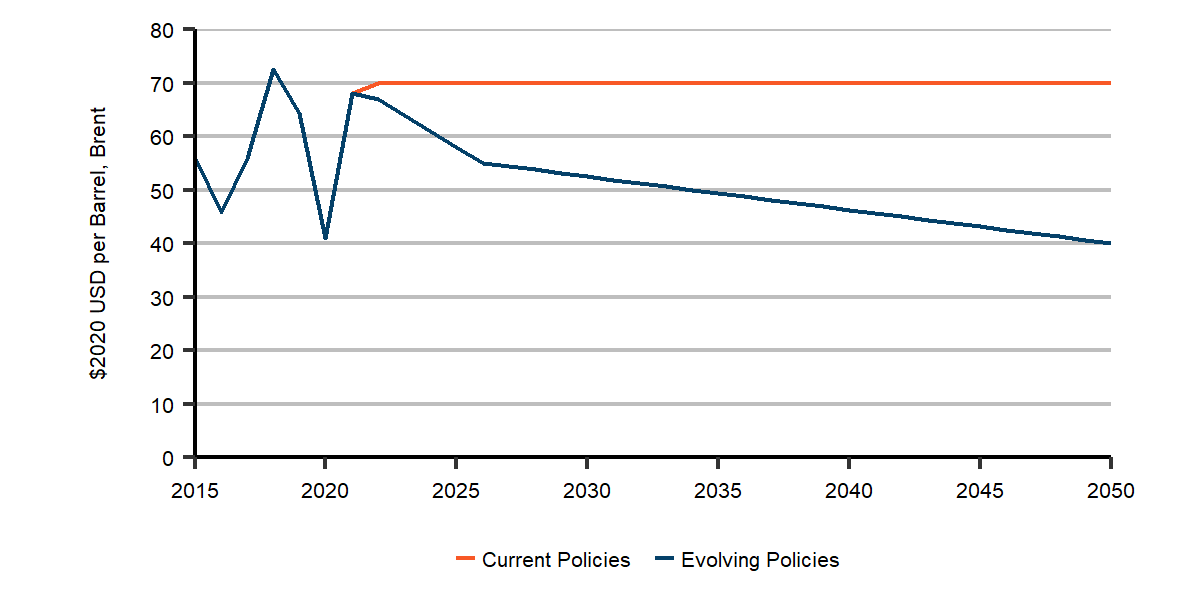 Description: This figure shows Brent crude oil price assumptions in 2020 US$ per barrel from 2015 to 2050 for both scenarios. The Current Policies Scenario remains at $75 for most of the projection. The Evolving Policies Scenario Brent crude oil price decreases to $55 by 2026, then to $40 by 2050.