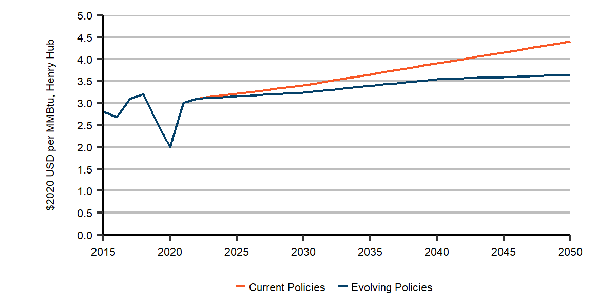 Figure A.4: Henry Hub Natural Gas Price Assumptions to 2050, Evolving and Current Policies Scenarios