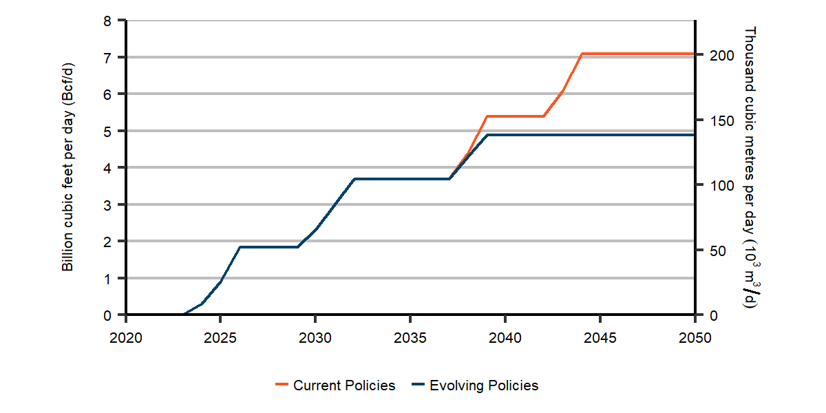 | General Implication | Due to increasing policy action, global natural gas demand is lower than the Current Policies Scenario. | Less policy action leads to higher global natural gas demand compared to the Evolving Policies Scenario. |