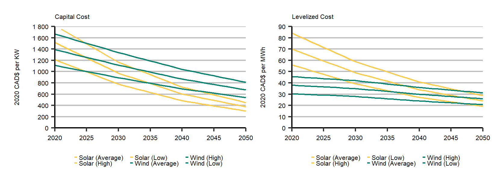 Figure A.6: Wind and Solar Capital Costs and Levelized CostFootnote 12 Assumptions to 2050, Evolving Policies Scenario