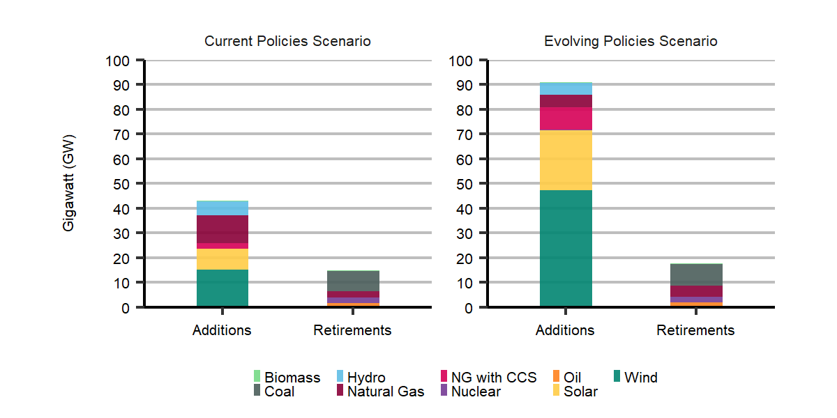 Description: This graph shows the total additions and retirements of electric generation capacity by 2050 in the Evolving Policies Scenario and Current Policies Scenario, and breaks it down by fuel source. In the Evolving Policies Scenario, these additions include 47.2 GW of wind, 14.0 GW of natural gas, 24.2 GW of solar, 4.7 GW of hydro, 0.4 GW of nuclear, and 0.3 GW of biomass. Retirements include 8.8 GW of coal, 2.3 GW of nuclear, and 1.8 GW of oil. In the Current Policies Scenario, these additions include 13.4 GW of natural gas, 15.0 GW of wind, 5.5 GW of hydro, 8.7 GW of solar, and 0.5 GW of biomass. Retirements include 8.2 GW of coal, 2.3 GW of nuclear, and 1.6 GW of oil.