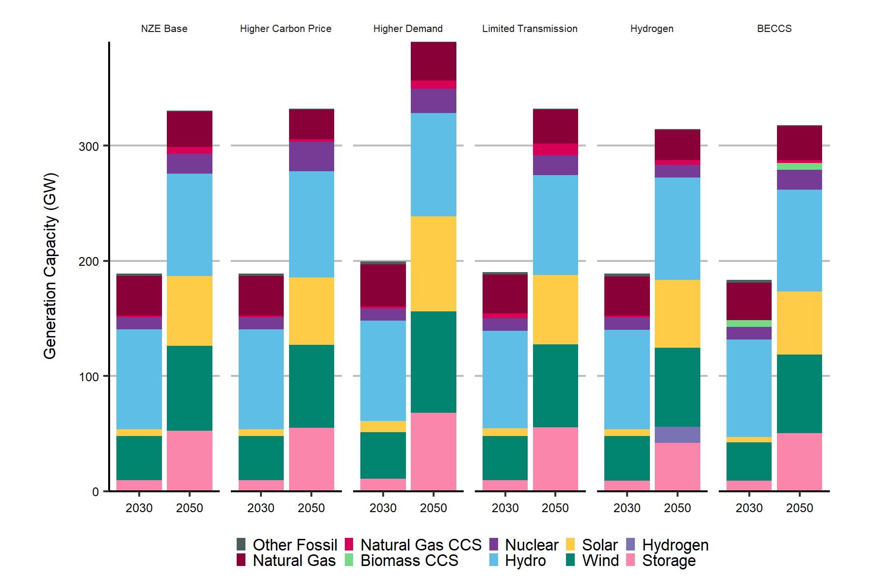 Description: This chart shows installed electricity generation capacity by technology in 2030 and 2050 for the following scenarios: NZE Base, Higher Carbon Price, Higher Demand, Limited Transmission, Hydrogen, and BECCS. Installed capacity, given in gigawatts, is as follows: