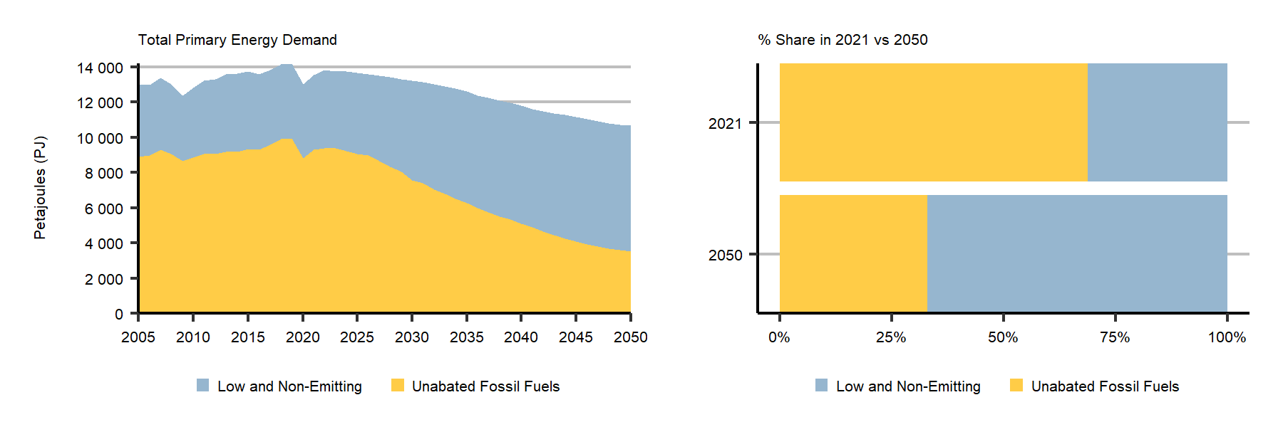Description: This figure shows two charts. The first stacked area chart compares low emissions energy demand with unabated fossil fuel energy demand in the Evolving Policies Scenario. The vertical axis units are Petajoules (PJ), and the horizontal axis shows years from 2005 to 2050. In 2021, unabated fossil fuel energy demand is about 9 300 PJ, and low emissions energy demand is about 4 200 PJ. By 2050, the share of unabated fossil fuel energy demand is about 3 500 PJ, and low-emission energy demand is about 7 200 PJ. The second chart compares shares of low-emission and unabated fossil fuel energy demand in 2021 and 2050 in the Evolving Policies Scenario. In 2021, the share of low emissions energy demand is 31%, and 66% by 2050, with unabated fossil fuel energy demand making up the remainder.
