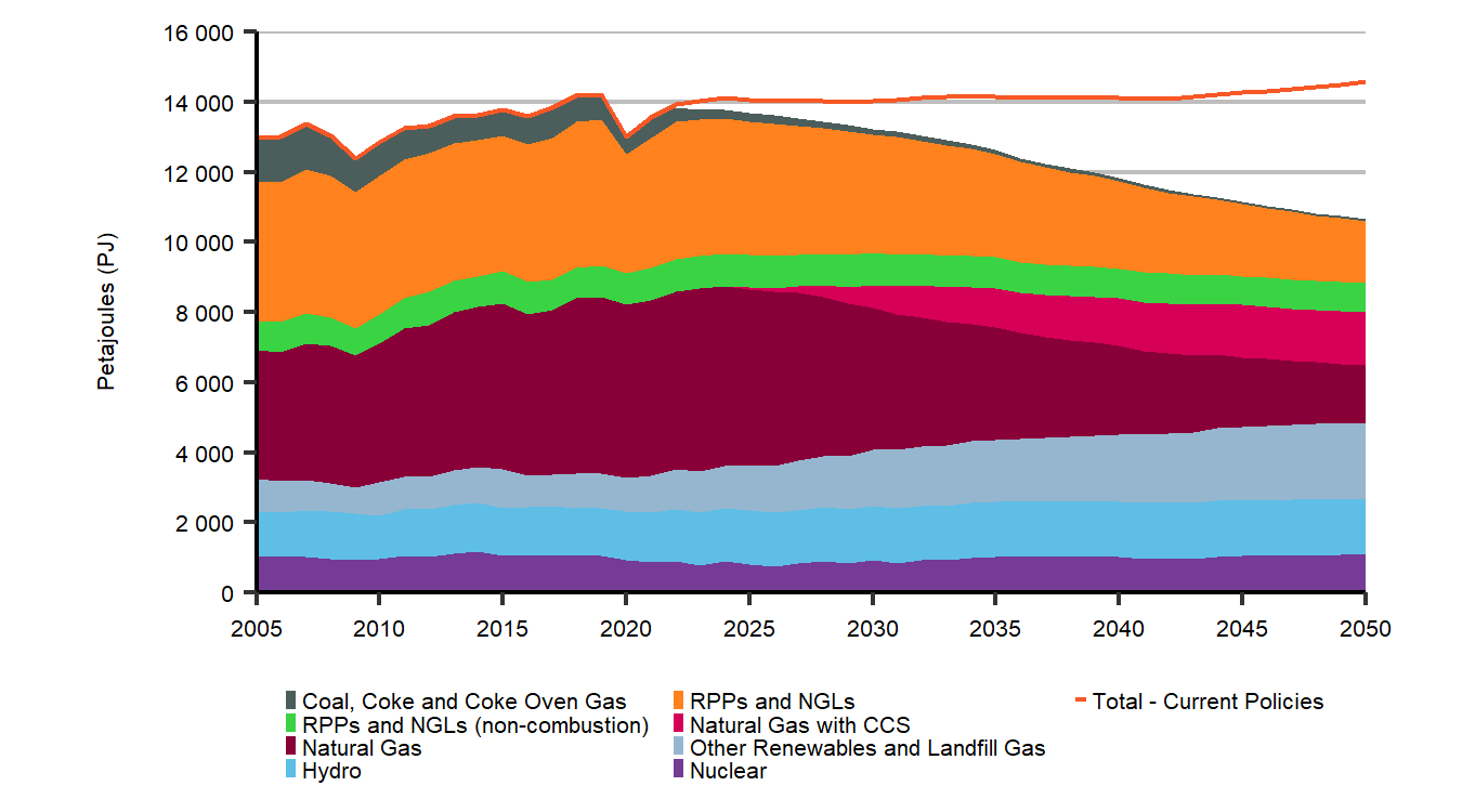 Description: This chart breaks down primary energy demands in the Evolving Policies Scenario, by fuel, throughout the projection period. It also shows total primary energy demand for the Current Policies Scenario. In the Evolving Scenario, coal, coke and coke oven gas demand decreases from 713 petajoules (PJ) in 2019 to 58 PJ in 2050. Refined petroleum product (RPP) demand decreases from 5 067 PJ in 2019 to 2 601 PJ in 2050. Natural gas demand decreases from 5 045 PJ in 2019 to 1 512 PJ in 2050. Hydro demands increase from 1 353 PJ in 2019 to 1 607 PJ in 2050. Nuclear demands increase from 1 057 PJ in 2019, to 1 073 PJ in 2050. Other renewables and landfill gas demand increases from 984 PJ in 2019, to 2 148 PJ in 2050. Total primary demand in the Evolving Policies Scenario decreases from 14 219 PJ in 2019, to 10 668 PJ in 2050, compared to an increase to 14 567 PJ in the Current Policies Scenario.