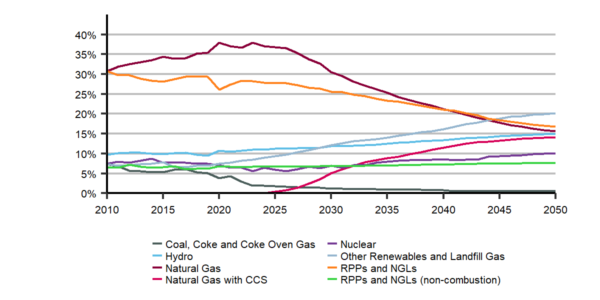 Description: This chart compares primary energy use from 2010 to 2050, by fuel in the Evolving Policies Scenario. Coal, Coke, and Coke Oven Gas’ share decreases from 7% in 2010 to 1% in 2050. Hydro’s share increases from 10% in 2010 to 15% in 2050. Natural gas’ (without CCS) share declines from 31% to 16%. Natural gas with CCS increases from 1% in 2027 to 14% in 2050. Nuclear’s share increases from 7% in 2010 to 10% in 2050. Other Renewables and Landfill Gases’ share increases from 7% in 2010 to 20% in 2050. RPP’s share decreases from 37% in 2010 to 24% in 2050.