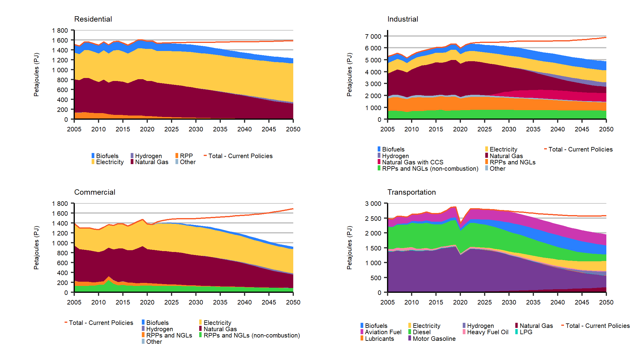 Residential: This chart breaks down fuel demand for the residential sector in the Evolving Policies Scenario. Electricity demand increases from 574 PJ in 2010 to 785 PJ in 2050. Natural gas demand decreases from 630 PJ in 2010 to 303 PJ in 2050. RPPs and NGL demands decrease from 121 PJ in 2010 to 10 PJ in 2050. Biofuel demands decrease from 171 PJ in 2010 to 134 in 2050. Lastly, other fuel demands stay at 0 PJ throughout the projection period.