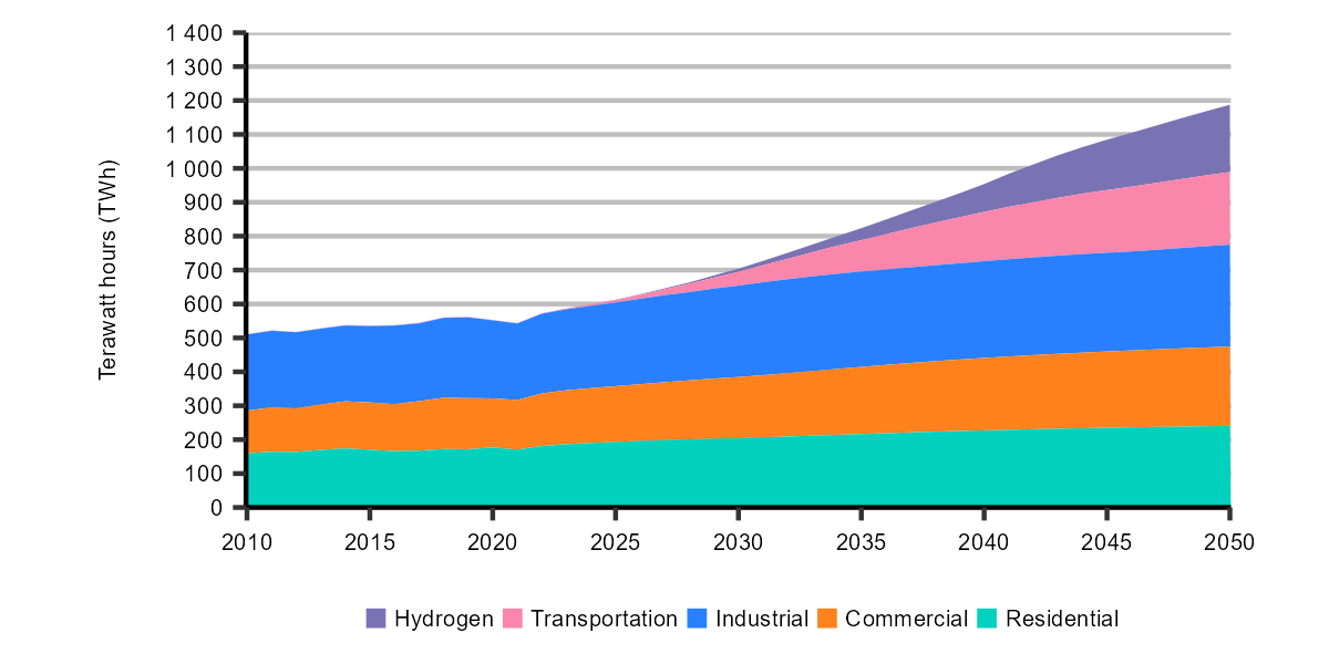 Electricity demand grows steadily in the residential, commercial, and industrial sectors. Transportation and hydrogen production, which are near zero now, become major drivers of growth in the projection.