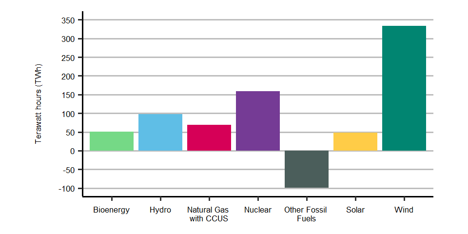Description: This column chart shows changes in electricity generation between 2021 and 2050 in the Global Net-zero Scenario, by technology. Wind sees the most significant increase, followed by nuclear, hydro, natural gas with CCUS, bioenergy, and solar. Other fossil fuels see a marked decline in terms of electricity generation.