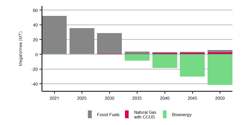 Total electricity generation has positive emissions before 2035. By the early 2030s, bioenergy becomes a net-negative source of emissions and more than offsets residual emissions from fossil fuels and natural gas with CCUS for electricity generation. Bioenergy then becomes an increasingly significant source of net-negative emissions until the end of the projection period.