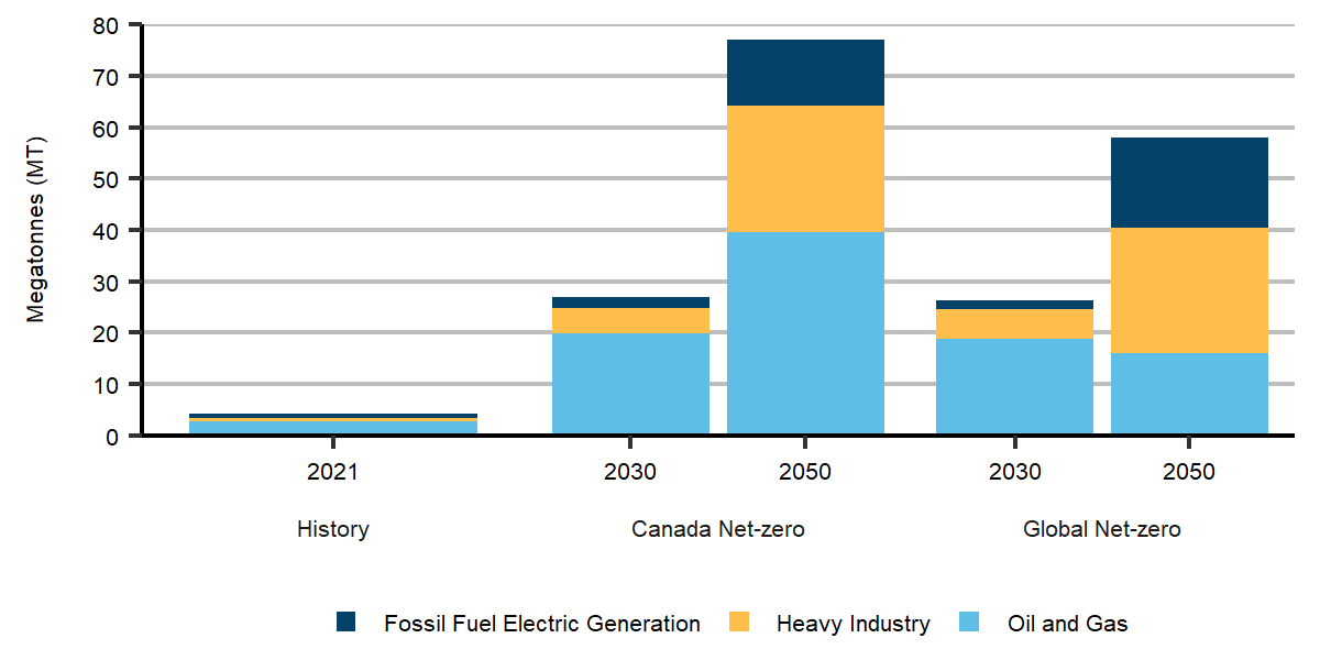 As shown in Figure ES.6, CCUS is used to capture CO2 emissions from the electricity, heavy industry, and oil and gas sectors in both net-zero scenarios. By 2050, nearly 60 MT of CO2 are captured from these sectors using CCUS in the Global Net-zero Scenario, which is about 9% of Canada’s total GHG emissions in 2021. In the Canada Net-zero Scenario, almost 80 MT of CO2 are captured by 2050, as there are more emissions to be captured from the greater amount of fuel used to produce oil and natural gas.