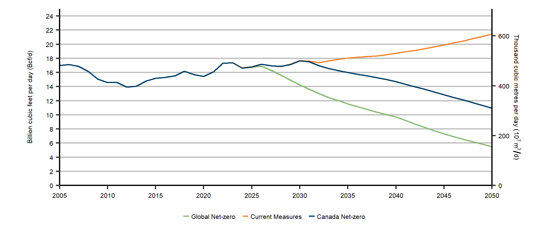 In the Global Net-zero Scenario, we assume that global prices of oil and natural gas fall steeply in response to declining global demand for fossil fuels over the coming decades. In this scenario, we project that Canadian crude oil production falls to 1.2 million barrels per day (MMb/d) (194 thousand cubic metres per day (10³m³/d)) by 2050, 76% lower than in 2022 as shown in Figure ES.8. As shown in Figure ES.9, natural gas production falls by 68% over the same period, reaching 5.5 billion cubic feet per day (Bcf/d) (156 million cubic metres per day (106m³/d)) by 2050.