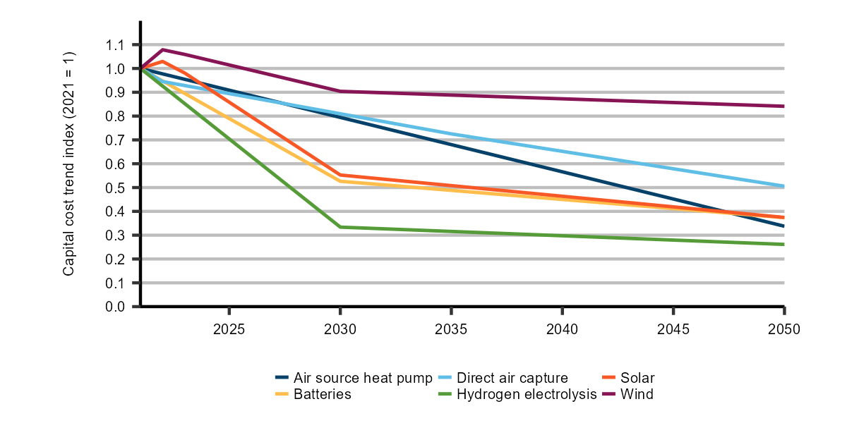 Description: This line chart shows the evolution of capital cost trends for key technologies over the projection period in the Global Net-zero Scenario, starting with 2021=1 as the index. The key technologies are air source heat pump, direct air capture, solar, batteries, hydrogen electrolysis, and wind.