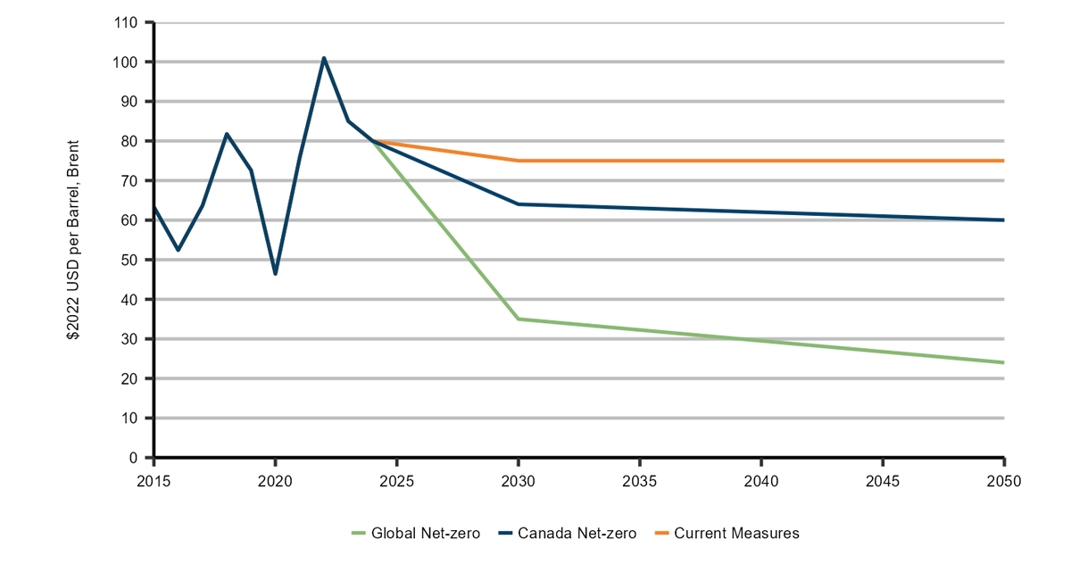 - Canada Net-zero Scenario: Global climate action increases, but less quickly. Global crude oil demand and crude oil prices fall, but less than in the Global Net-zero Scenario.