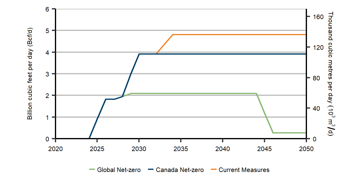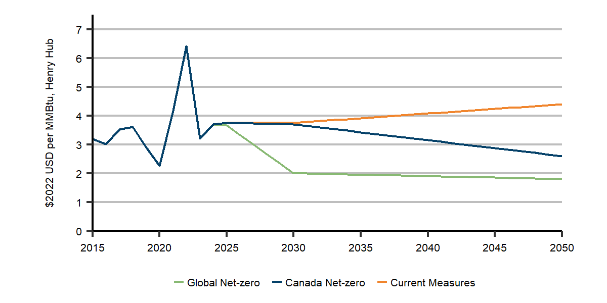 - Canada Net-zero Scenario: Global climate action increases, but less quickly. Global natural gas demand, and natural gas prices fall, but less than in the Global Net-zero Scenario.