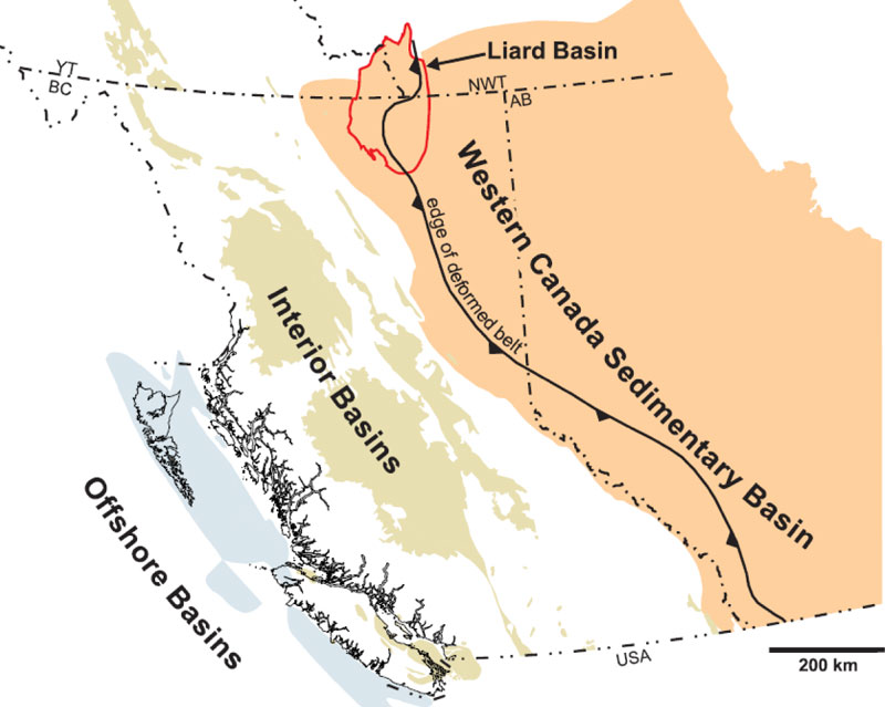 The Liard Basin is a lightly drilled region at about 60 °N that straddles the boundaries of the Northwest Territories (NWT), Yukon, and the province of British Columbia (B.C.) (Figure 1). It is located at the far northwest corner of the Western Canada Sedimentary Basin (WCSB), Canada’s major oil and gas producing area. The Liard Basin’s unconventionalFootnote 2 potential had not been assessed in detail before this study.