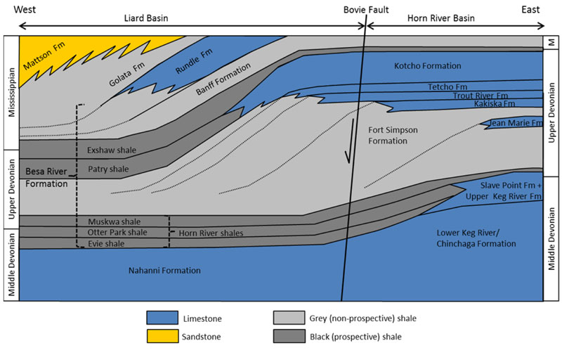 The Middle Devonian to Middle Mississippian Besa River Formation (deposited from 385 Ma to 335 Ma ago) is a succession of shales in the Liard Basin (Figure 2). The Besa River Formation ranges from 300 metres (m) thick to the west to over 2 000 m thick near the Bovie Fault to the east.