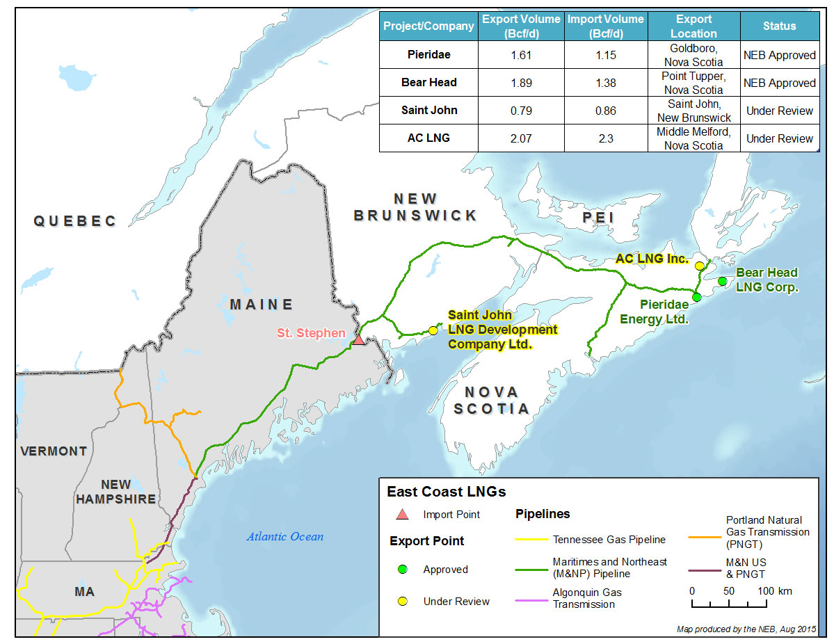 The Maritimes natural gas market is connected with the U.S. via the Maritimes & Northeast Pipeline (M&NP). The current capacity of the Canadian portion of M&NP is approximately 0.6 Bcf/d, and is insufficient to transport all the volumes proposed to be exported from the Maritimes. Moreover, ongoing pipeline bottlenecks in the U.S. are currently preventing U.S. Northeast supply from reaching Maritimes consumers. Should Maritimes LNG projects proceed, additional infrastructure may be required to service the LNG plants.