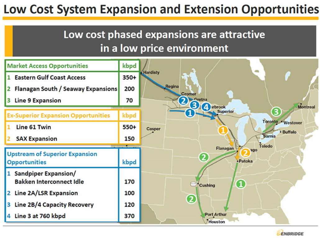 Description: This map appeared in Enbridge’s March 2015 investor’s presentation, and is titled “Low Cost System Expansion and Extension Opportunities: Low cost phased expansions are attractive in a low price environment”. The individual projects are colour-coded with the text boxes, and the sizes of the pipeline expansions are listed in thousand barrels per day. The titles of the green, orange and blue boxes are “Market Access Opportunities”, “Ex-Superior Expansion Opportunities” and “Upstream of Superior Expansion Opportunities”, respectively.