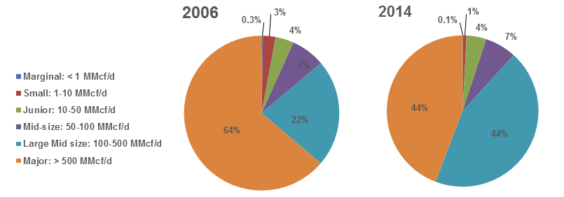 Large mid-sized producers have led a decade-long shift away from conventional resources toward tight gas production in western Canada. Tight gas production increased from 27 per cent of western Canadian natural gas production in 2006 to 42 per cent in 2014. In that same period, the share of “operated”Footnote 1 tight gas produced by majors decreased while large mid-sized producers’ share increased, such that both groups produced 44 per cent each in 2014.