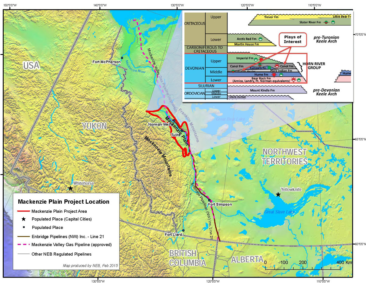 Description: The map shows the location of the Mackenzie Plain project area in the Northwest Territories defined with a red line, inlaid in the top right corner of the map shows an intersectional diagram of the shale plays: Canol and Bluefish.