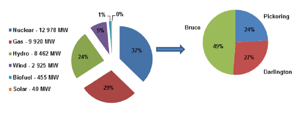 Description: The chart shows installed electricity generation capacity by fuel type for the month of June 2015. Ontario’s installed generation capacity is 34 780 MW. The installed nuclear capacity is 12 978 MW or 37 per cent of the total installed generation capacity. Of that, Bruce makes up 49 per cent, followed by Darlington at 27 per cent and Pickering at 24 per cent.