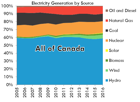 Description: This graph shows the composition of Canada’s electricity generation between 2005 and 2016. Hydro averaged 59.6%. Wind increased from 0.2% to 4.7%. Biomass increased from 1.3% to 2.0%. Solar grew from zero to 0.5%. Coal declined from 16.1% to 9.3%. Natural gas increased from 6.8% to 9.6%. Oil and diesel declined from 1.8% to 0.5%.
