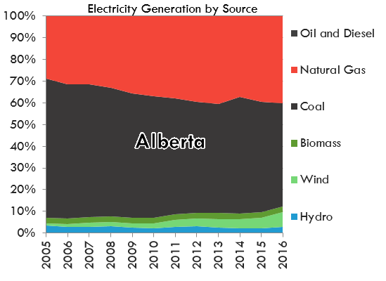 Description: This graph shows the composition of Alberta’s electricity generation between 2005 and 2016. Hydro accounted for 3.4% of generation in 2005 and 2.8% in 2016. Biomass increased from 2.5% to 2.7% over that period. Wind increased from 1.1% in 2005 to 6.9% in 2016. Coal decreased from 64.3% to 47.4%. Natural gas, increased its share from 28.7% to 40.3%.