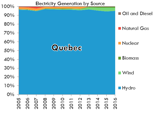 Description: This graph shows the composition of Quebec’s electricity generation between 2005 and 2016. On average, hydro accounted for 95.9% of generation. Wind increased from 0.2% in 2005 to 3.6% in 2016. Biomass increased from 0.4% to 1.0%. Nuclear power dropped from 2.4% to zero in 2012. Natural gas, oil and diesel accounted for about 0.2% in 2016.