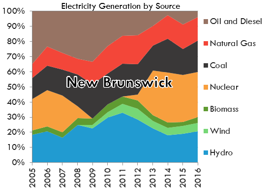 Description: This graph shows the composition of New Brunswick’s electricity generation between 2005 and 2016. Hydro fluctuated from 18.4% in 2005, to 33.0% in 2011, then decreased to 20.6% in 2016. Wind’s share increased from zero to 5.6%. Biomass remained stable at around 4.0%. Nuclear dropped to zero between 2009 and 2011 then increased to 29.9% in 2016. Coal fluctuated from 13.9% in 2005, to an average of 21.6% between 2009 and 2011, and was 20.7% in 2016. Natural gas increased from 9.4% in 2005 to 15.5% in 2016, while oil and diesel dropped from 34.7% to 3.9% over these years.