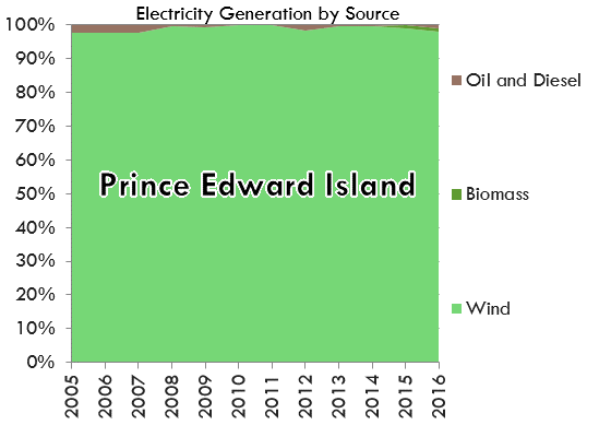 Description: This graph shows the composition of PEI’s electricity generation between 2005 and 2016. Wind increased from 97.8% to 98.1% of generation. Biomass generated 0.9% in 2016. Oil and diesel fell from 2.2% to 1.0%.