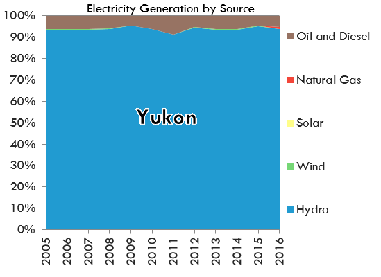 Description: This graph shows the composition of Yukon’s electricity generation between 2005 and 2016. Hydro generation averaged 93.8% from 2005 to 2016. Oil and diesel generation accounting for an average of 6.0%. Wind, solar and natural gas generated about 0.8% combined in 2016.