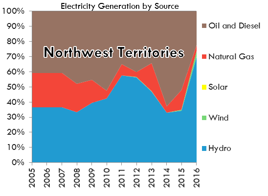 Description: This graph shows the composition of Nunavut’s electricity generation between 2005 and 2016. Oil and diesel accounted for almost all of generation since 2005. Nunavut’s solar generation is estimated to be less than 0.1 GW.h per year. It is too small to be visible on the graph.
