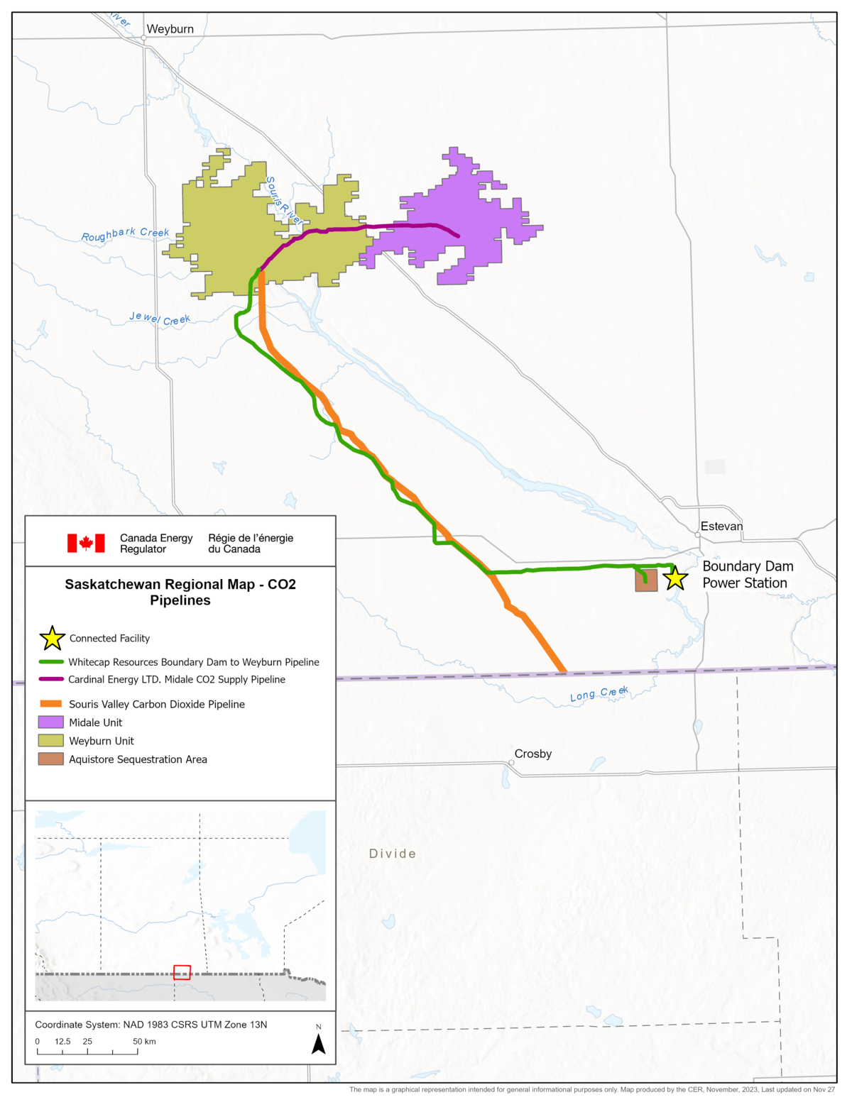 Description: The Souris Valley pipeline (orange line) runs from the Canada-U.S. border to a terminal near Goodwater, SK, where the CO2 is injected in the Weyburn-Midale oil field for enhanced oil recovery. The Souris Valley pipeline is connected to Dakota Gasification Company (DGC) pipeline, which transports CO2 captured at the DGC’s plant near Beulah, North Dakota to the Canada-U.S. border. The Whitecap Resources Boundary Dam CO2 pipeline (green line) transports CO2 captured at SaskPower’s Boundary Dam power plant to the Aquistore CO2 Sequestration Project and to the Weyburn oil field. The Cardinal Energy Midale CO2 Pipeline (purple line) transports CO2 from the terminus of the Souris Valley pipeline to the Midale oil field.
