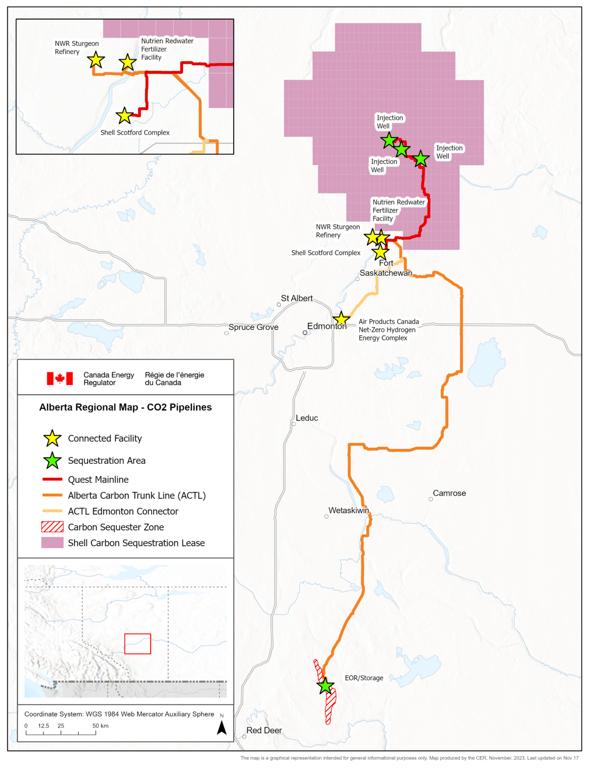 Description: This map shows the route of the CO2 pipeline of the Quest CCS project and the Alberta Carbon Trunk Line (ATCL). The Quest pipeline (brown line) transports CO2 captured at the Scotford upgrader in the oil sands area to three CO2 sequestration wells near Thornhill, AB, where the CO2 is injected in a deep saline reservoir. The ATCL (orange line) connects the Sturgeon Refinery, and the Nutrien’s Redwater Fertilizer plant, both northeast of Edmonton, to oil fields where the CO2 is sequestered near Clive, AB. The ACTL’s Edmonton Connector (light orange line) is planned to connect ACTL to the Air Products’ Blue Hydrogen plant near Edmonton, AB.