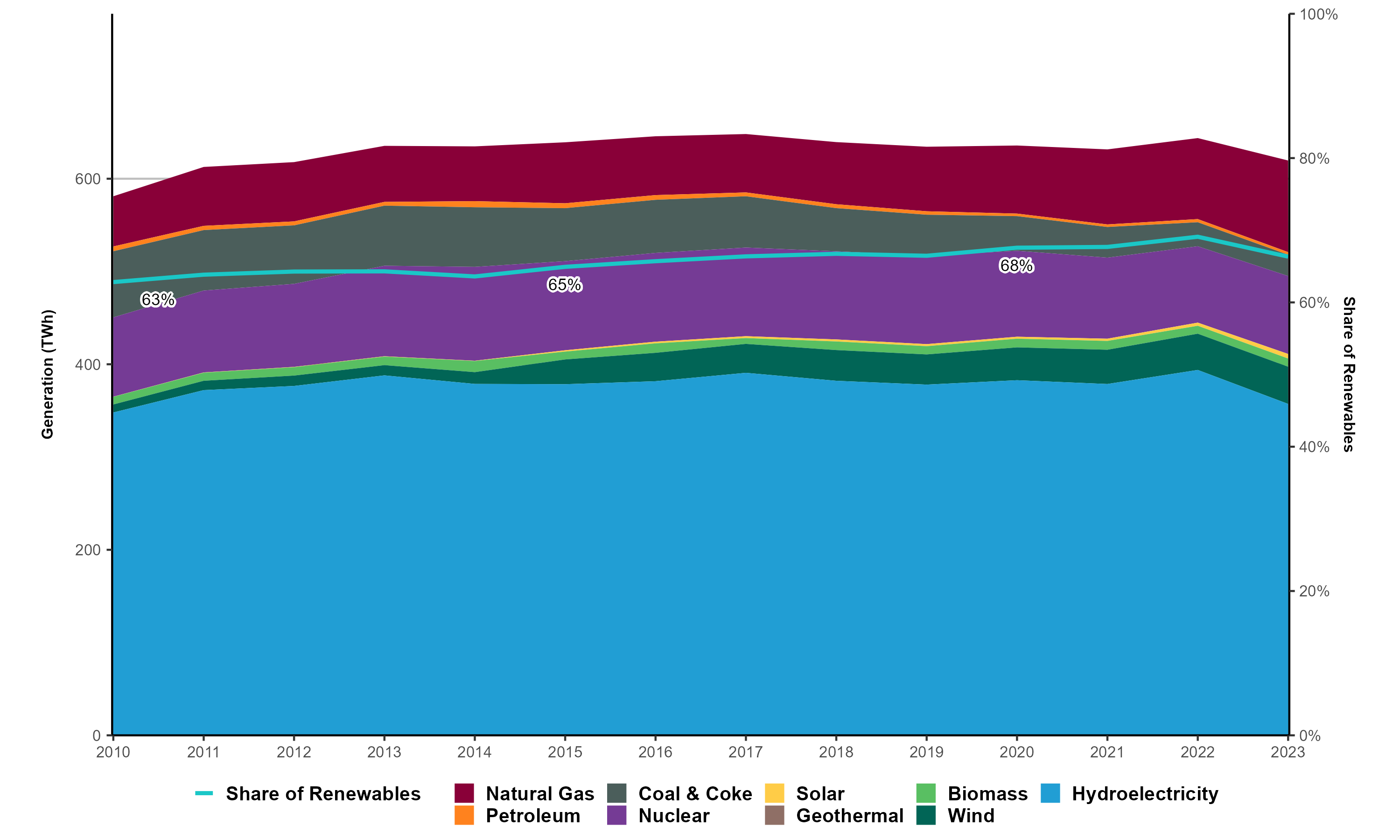 Between 2010 and 2023, total electricity generation in Canada increased by 6.6% (from 581 TWh to 620 TWh), while renewable generation rose by 12.6% (from 365 TWh to 411 TWh), increasing its share of the mix from 62.8% to 66.3%.