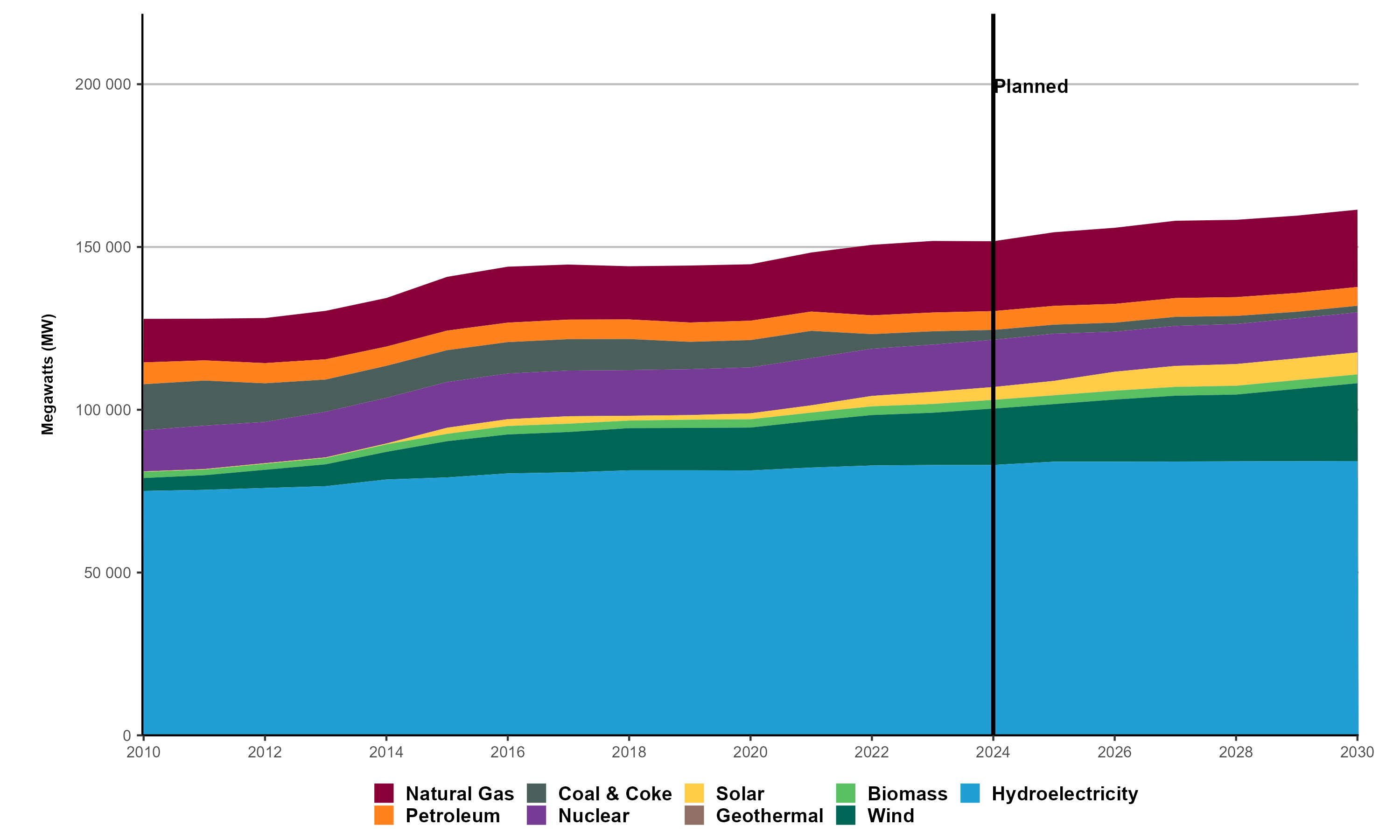 Source: The primary source for electricity generation capacity data comes from Statistics Canada. Table 25-10-0022-01 and Table 25-10-0023-01 are combined to display data for all of the categories. It is supplemented by additional project-level data for planned capacity from provincial governments, utilities, and system operators, as well as industry associations.
