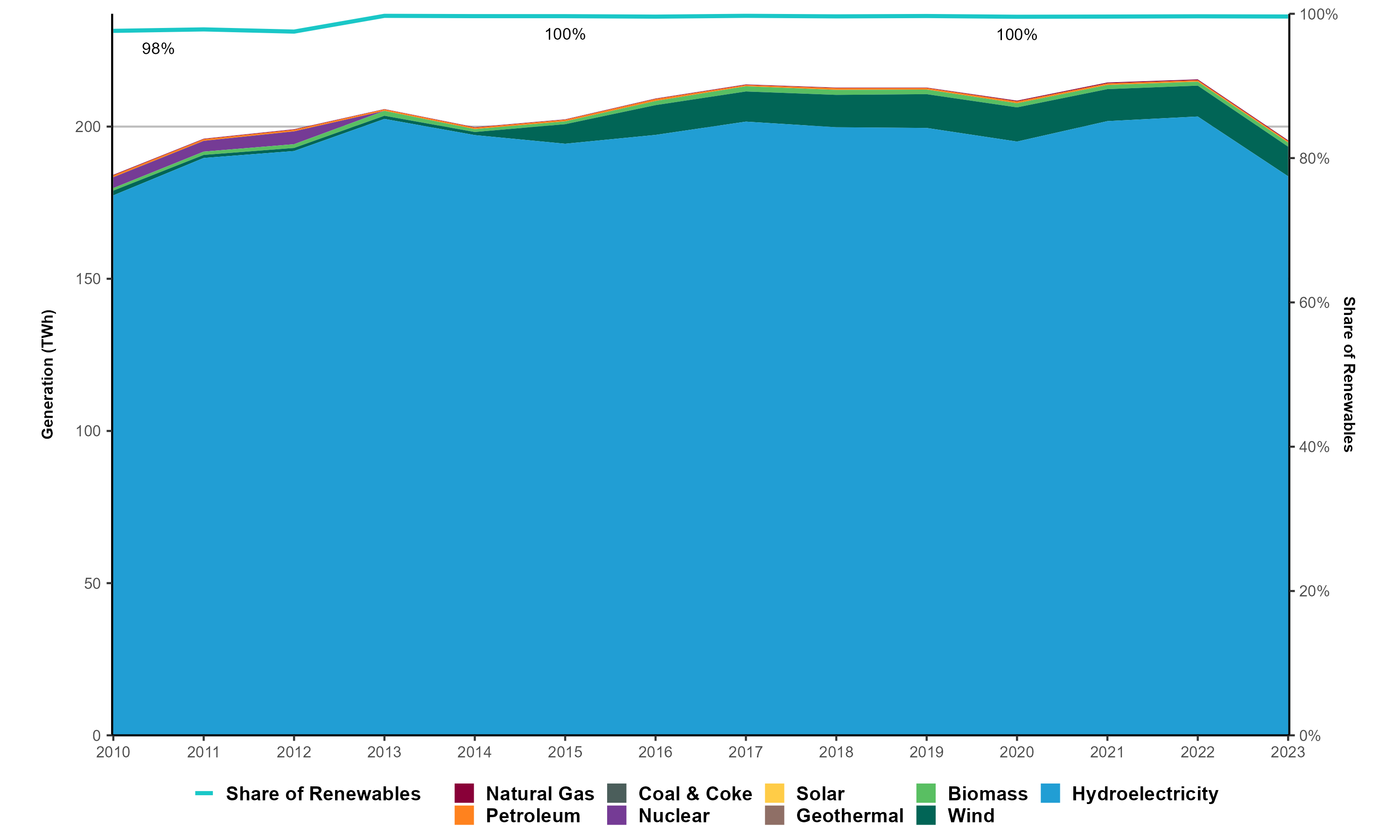 Text Alternative: This graph illustrates electricity generation from 2010 to 2023 in Quebec. In 2010, Quebec’s total generation was 184.2 TWh (97.6% renewable). In 2023, total generation was 195.5 TWh (99.6% renewable). Most generation in 2023 came from hydroelectricity (94.0%), wind (5.0%), and biomass (0.7%).