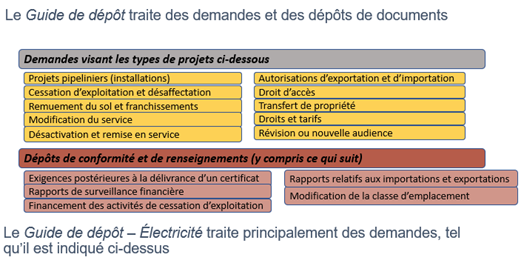 - aider les sociétés réglementées par la Régie à déterminer si un dépôt est nécessaire selon la LRCE et les règlements afférents à celle-ci ou à l’Office national de l’énergie;