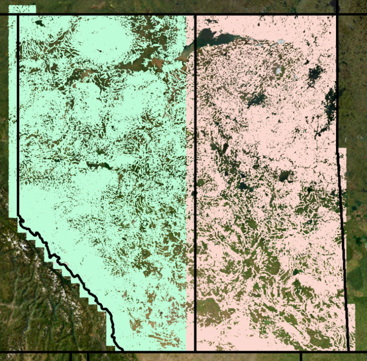 Par exemple, l’image ci-après, qui provient du système d’information géographique de la Régie, illustre la portée des jeux de données hydrographiques de l’Alberta (vert) et de la Saskatchewan (rose). Dans la méthode de calcul des CECE de 2021, le dénombrement en double se produit dans les zones en vert et en rose qui dépassent les limites géographiques des provinces. Bien qu’il ne soit pas possible de le voir sur l’image, car la couche de données de la Saskatchewan le cache, le jeu de données albertaines s’étend lui aussi vers l’est, en Saskatchewan, le long de la frontière alberto-saskatchewanaise.